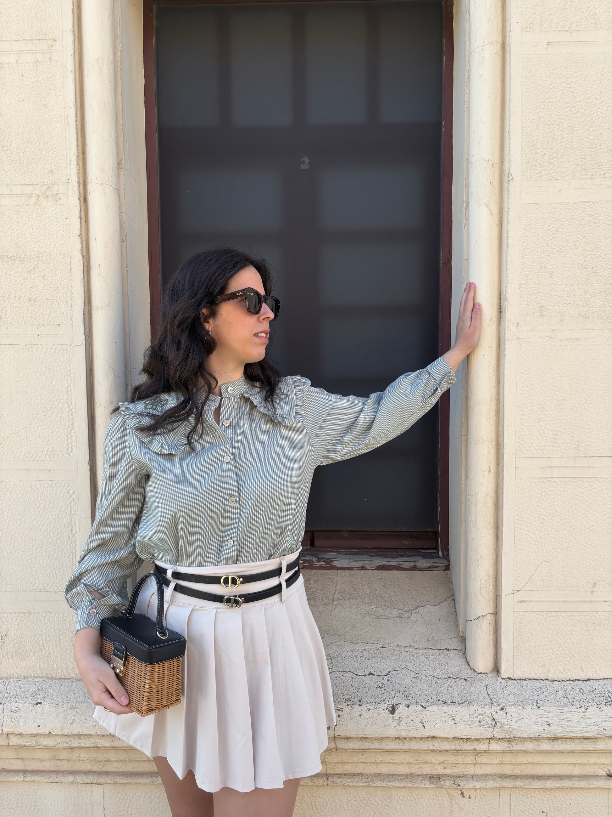 Falda de tablas en color beis. Su diseño de tablas crea un movimiento fluido y delicado, mientras que el color neutro la convierte en una pieza versátil que se adapta fácilmente a cualquier ocasión. Lo que la hace aún más especial es su doble cinturón.