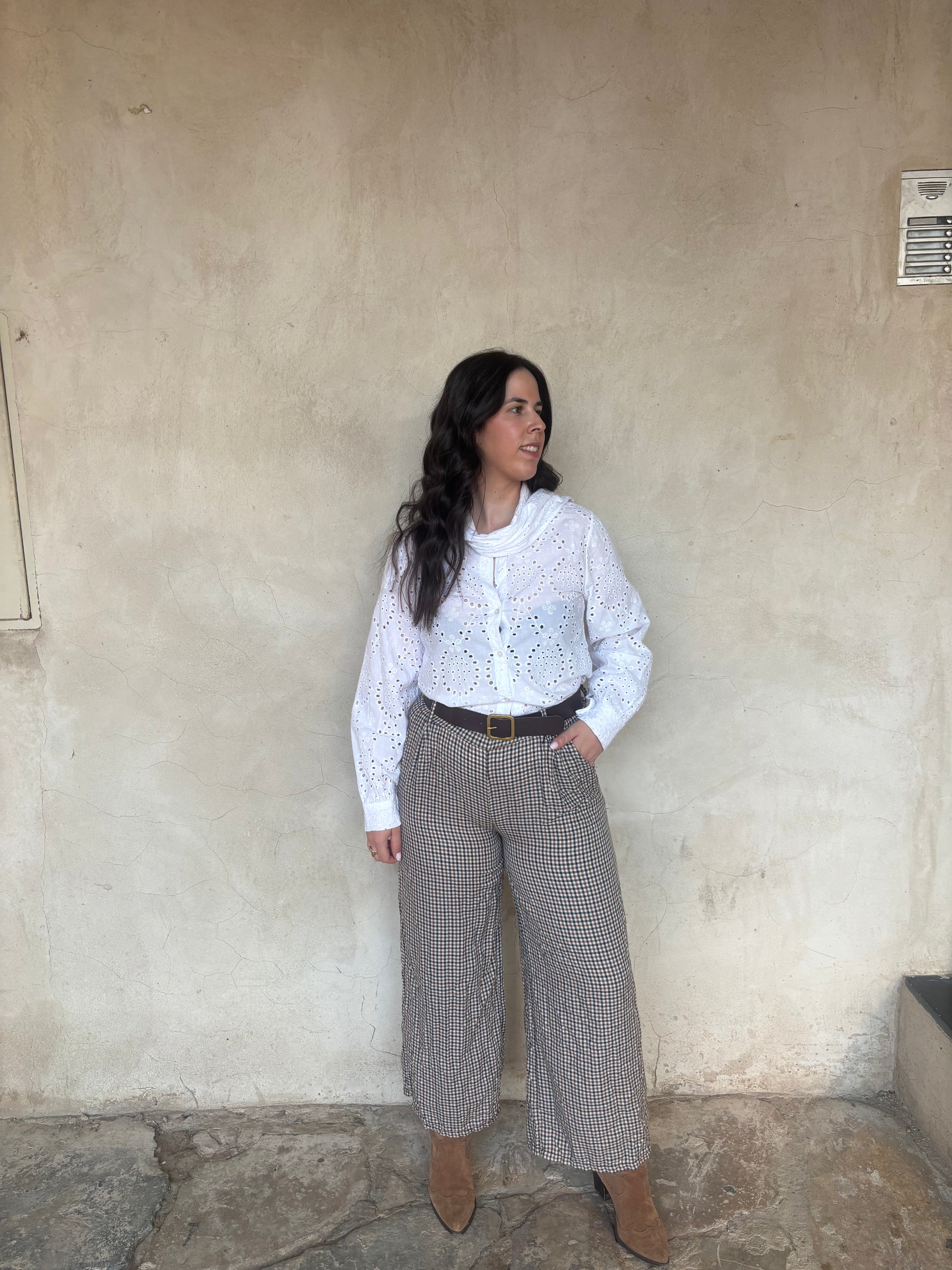 Pantalón vichy con tonos en marrón, azul y blanco, lo que lo hace muy combinable con cualquier parte de arriba en lisa. La tela del pantalón es muy fluida y en la cintura lleva goma por lo que resulta muy cómodo de llevar a la vez que elegante. Además el detalle del cinturón en marrón chocolate le da el toque final a esta prenda tan en tendencia actualmente.